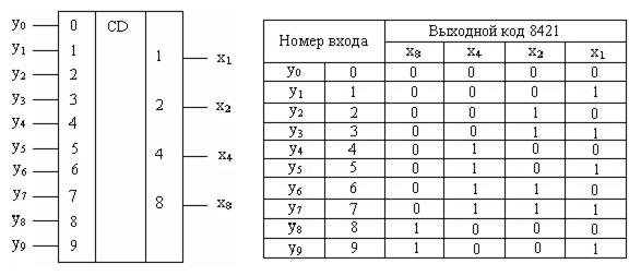 Шифратор осуществляет преобразование десятичных чисел в двоичную систему счисления. На рис.9.9 приведено символическое изображение шифратора, преобразующего десятичные числа 0, 1, 2, … , 9 в выходной код 8421 и его таблица истинности. Символ CD образован из букв английского слова Coder. Слева показаны 10 входов шифратора, справа – выходы шифратора; цифрами 1,2,4,8 обозначены весовые коэффициенты двоичных четырёх разрядов шифратора.