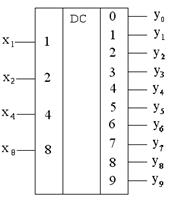 Дешифраторы используются для преобразования двоичных чисел в десятичные числа и находят применение в печатающих устройствах. В таких устройствах двоичное число, поступая на вход дешифратора, вызывает появление десятичного числа только на одном определённом его выходе. На рис.9.11 приведено символическое изображение дешифратора и его таблица истинносити. Символ DC образован от английского слова Decoder. Слева показаны входы, на которых отмечены весовые коэффициенты двоичного кода, справа выходы десятичных чисел. На каждом входе образуется десятичное число при определенных комбинациях входного кода.