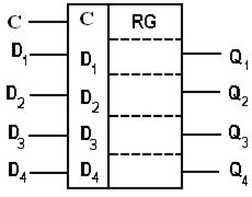 На рис.9.13 изображено условное обозначение и схема четырёхразрядного регистра параллельного действия, построенного на синхронных D – триггерах. Регистр имеет четыре входа D1÷D4 информационных и один синхронизирующий вход С.