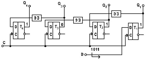 Работу регистра рассмотрим на примере записи числа 1011. С приходом импульса сдвига на вход С и подаче на вход D единицы старшего разряда числа, триггер Т1 переводится в состояние 1 (Q1). В регистре используются элементы задержки ЭЗ, которые осуществляют задержку во времени перемещения сигнала с одного триггера на другой. При подаче очередного импульса сдвига на вход С и подаче на вход D второго разряда (нуля) числа, на выходе Q1 появится 0 , а 1 из триггера Т1 через элемент ЭЗ переместится в триггер Т2. С приходом очередного импульса сдвига на вход С и подаче на вход D третьего разряда (единицы) числа, триггер Т1 установится в 1 и т.д. Путём последовательной подачи кодов чисел на вход D и импульсов сдвига на вход С, число записывается в регистр.
