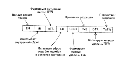 Формат регистра управления приведен на рис. 9.16. Бит 0 этого регистра должен содержать 1 до вывода данных, а бит 2 должен быть в состоянии 1 до приема данных. Программный ответ модему осуществляется установкой в 1 бита 1, так как при этом на выходе DTR формируется 0, а инверсия DTR обычно подключается к линии CD модема. Состояние 1 бита 3 формирует TxD = 0, вызывая передачу символов разрыва.