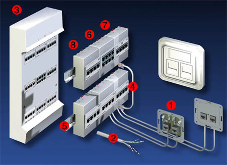 Сеть LexCom Home основана на структурированной кабельной системе с применением широкополосного кабеля витой пары. С помощью этого кабеля все розетки в помещениях подключаются к распределительному центру – к патч-модулям или патч - панели.