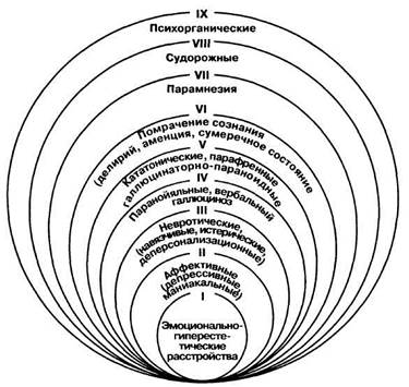 Эти идеи были использованы в клинической синдромологии А.В. Снежневским. По нарастанию тяжести синдромов им были выделены 9 кругов для продуктивных (позитивных) синдромов: 1) эмоционально-гиперестетические, астенические расстройства, 2) аффективные, 3) невротические и деперсонализации, 4) паранойяльные и галлюцинозы, 5) галлюцинаторно-параноидные, парафренные и кататонические; 6) помрачения сознания; 7) парамнезии; 8) судорожные синдромы; 9) психоорганические (рис. 1).
