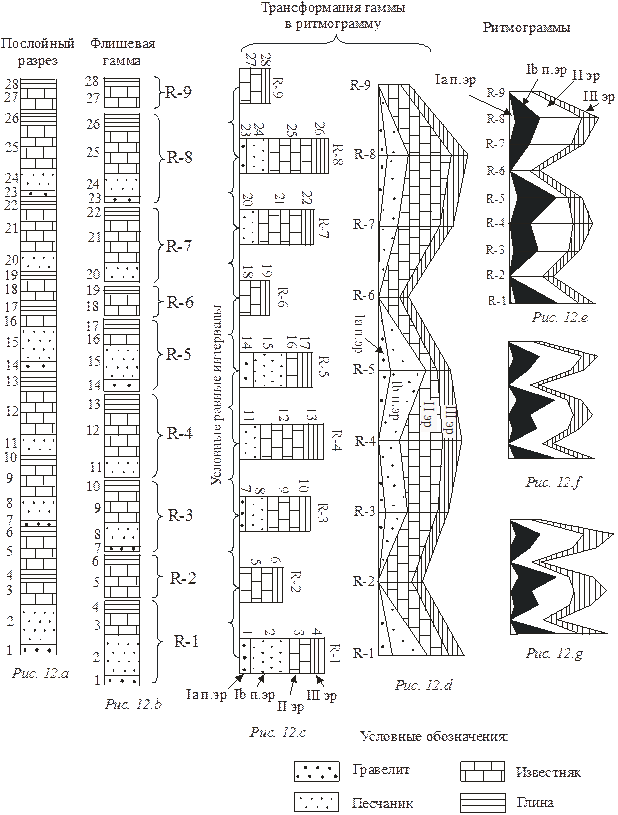 2. Разрез разбиваем на ритмы (R-1, R-2 и т.д.), их элементы (I эр, II эр и III эр) и подъэлементы (Iа п. эр; Ib п. эр). Такой разрез называется флишевой гаммой. Для наглядности ритмы во флишевой гамме разделяем пустыми промежутками (Рис. 12.b).