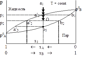 В точке О, находящейся между линиями жидкости и пара, средняя мольная доля вещества А в системе равна хО, из чего следует