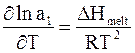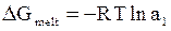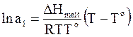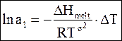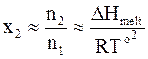 Для достаточно узкого диапазона температур теплоту плавления DHmelt можно считать постоянной. В связи с этим интегрирование уравнения (8 - 20) при условии, что стандартной активности растворителя (a1=1) отвечает стандартная теплота плавления То, дает