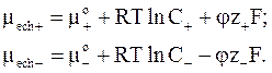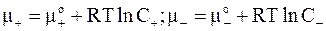 Для простоты примем зависимость химических потенциалов от концентраций ионов в форме