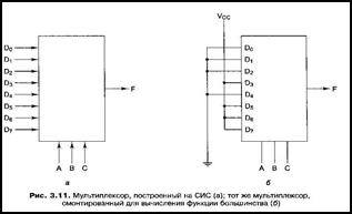 Использовав мультиплексор, мы можем реализовать функцию большинства, как показано на рис. 3,11, б. Для каждой комбинации А, В и С выбирается одна из входных линий. Каждый вход соединяется либо с сигналом Vcc (логическая 1), либо с землей (логический 0). Алгоритм соединения заключается в установлении значения входного сигнал Di равным значению в строке i таблицы истинности.