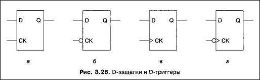 На рис. 3.26, в и г изображены триггеры. О том, что это триггеры, а не защелки, говорит уголок на синхронизирующем входе.