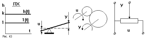В ответ на единичное ступенчатое воздействие сигнал на выходе мгновенно достигает величины в k раз большей, чем на входе и сохраняет это значение (рис.43). При k = 1 звено никак себя не проявляет, а приk = - 1 - инвертирует входной сигнал.