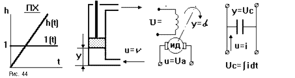 При k = 1 звено представляет собой “чистый” интегратор W(p) = 1/p. Интегрирующее звено неограниченно "накапливает" входное воздействие. Примеры интегрирующих звеньев: электродвигатель, поршневой гидравлический двигатель, емкость и т.п. Введение его в САУ превращает систему в астатическую, то есть ликвидирует статическую ошибку.