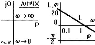 ЧХ показаны на рис.51. Все частоты звено пропускает с запаздыванием по фазе на 90о. Амплитуда выходного сигнала увеличивается при уменьшении частоты, и уменьшается до нуля при росте частоты (звено "заваливает" высокие частоты). ЛАЧХ представляет собой прямую, проходящую через точку L(