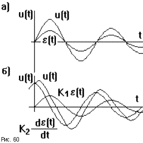 Так как при воздействии возмущения на объект управления отклонение регулируемой величины от требуемого значения происходит с конечной скоростью (рис.60б), то в начальный момент на вход регулятора подается очень малая величина e , вызывая при этом слабые управляющие воздействия u. Для повышения быстродействия системы желательно форсировать процесс управления.