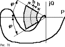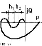 Как уже отмечалось, с ростом коэффициента передачи разомкнутой САУ растет модуль каждой точки АФЧХ и при некотором значении K = Kкр АФЧХ пройдет через критическую точку (рис.76) и попадет на границу устойчивости, а при K > Kкрзамкнутая САУ станет неустойчива. Однако в случае “клювообразных” АФЧХ (получаются из-за наличия внутренних обратных связей) не только увеличение, но и уменьшение K может привести к потере устойчивости замкнутых САУ (рис.77). В этом случае запас устойчивости определяется двумя отрезками h1 и h2, заключенными между критической точкой и АФЧХ.