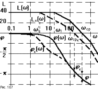 На рис.106 сплошными линиями показаны частотные характеристики исходной разомкнутой САУ при T1 = 0.5c, T2 = 0.02c, T3 = 0.002c, K = 10.