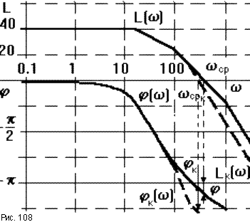 На рис.107 сплошными линиями изображены ЛЧХ разомкнутой САУ с параметрами: T1 = 0.05c, T2 = 0.01c, T3 = 0.001c, K = 100. Из рисунка видно, что САУ неустойчива. При увеличении постоянной времени T1 в 5 раз (T1’ = 0.2с) ЛАЧХ и ЛФЧХ приобретают вид, показанный на рисунке пунктирной линией. При этом видим, что замкнутая САУ становится устойчивой. Заметим, что сопрягающая частота W1 данного звена располагается левее частоты среза