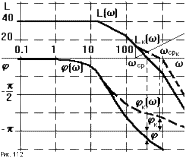 Передаточная функция идеального форсирующего звена Wф(p) = Tф(p)p + 1. При Tф(p)= 0.005с его ЛАЧХ выглядит так, как это показано на рис.112 тонкой сплошной линией. Частотные характеристики скорректированной САУ показаны пунктирными линиями. Из рисунка видно, что изначально неустойчивая САУ после коррекции стала устойчивой. Кроме того увеличилась частота среза, то есть повысилось быстродействие системы. Это достоинства данного способа корректировки. Вместе с тем высокочастотная часть ЛАЧХ сместилась вверх, то есть усилилось влияние высокочастотных помех. Поэтому данный способ называется демпфирванием с поднятием высоких частот. Это серьезный недостаток, ограничивающий применение данного способа корректировки.