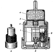1 – чека; 2 – тасьма; 3 – ізолятор; 4 – корпус; 1 – повзунець; 2 – корпус;