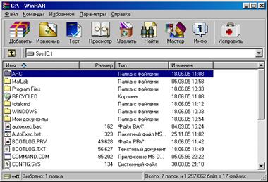 Ще один елемент інтерфейсу – панель інструментів. Вона міститься нижче меню і вище списку файлів (рис. 49). Кнопки на панелі інструментів повторюють пункти з меню Команды (зверніть увагу, що у всіх пунктів у цьому меню є “гарячі клавіші” для швидкого доступу). Під час перегляду вмісту архіву деякі кнопки можуть бути відключені, якщо їхні функції незастосовні до архіву.