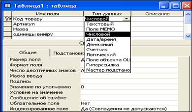 2. тип даних добирається зі списку, що розкривається, якщо натиснути кнопку зі стрілкою. Тип даних визначається значеннями, які передбачається вводити до поля. Існують такі основні типи даних: