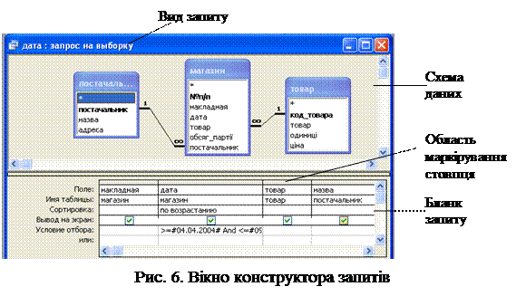 У схемі даних запиту відображаються обрані таблиці зі списком полів і зв’язки між ними.