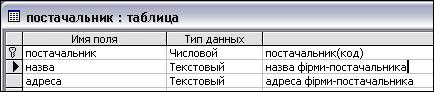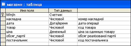 У вікні БД вибираємо об’єкт Таблиця → Создать → Конструктор → ОК. Вводимо назву та типи полів. Задаємо ключове поле №п/п (виділяємо поле → контекстне меню → Ключове поле). Закрити конструктор, вказавши назву таблиці Магазин.