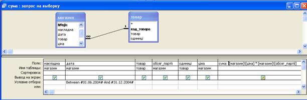 У вікні конструктора (рис. 9) перетягніть зі списку полів таблиці Магазин поля накладна, ціна і дата, зі списку полів таблиці Товар – поле товар.