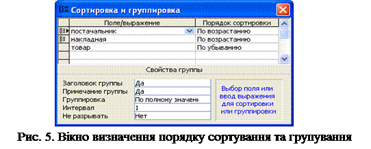 Визначити спосіб сортування полів, згрупувати записи за певним полем та додати розділи Заголовокгруппы та Примечание группы (рис. 5) можнау вікні Конструктора звітів за допомогою кнопки