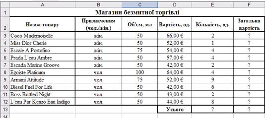 1. Створіть таблицю 1 Магазин безмитної торгівлі та виконайте всі необхідні обчислення. У комірки D3:D12 встановіть грошовий формат з двома знаками після коми. В комірку F3 введіть формулу =D3*E3. Скопіюйте її на весь стовпець F (до комірки F12).