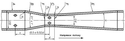 С – горловина; Е – дифузор; F – площини з’єднання елементів труби Вентурі