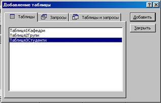 Рис. У вікні вибору таблиць виберіть таблицю “Таблиця3Студенти” і дайте команду “Добавити” (Add) (рис.) і команду “Закрити” (Close).