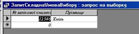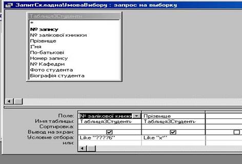 Відкрити запит ,наприклад, “ЗапитСортування” в режимі проектування (режим “конструктор”) і в нижній частині, яка називається QBL область, в полі “Умова відбору” (Criteria) колонки прізвище задати “Х*” а в колонці “Номер залікової книжки” “????6” (рис. );