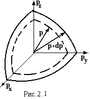 Поділ фазового простору на найменші елементи dГ, чи dГр називається його квантуванням. Знайдемо густину квантових станів спочатку у просторі імпульсів g(p), а потім перейдемо до енергій g(E). Для цього у просторі імпульсів виберемо сферу радіусом р, і порахуємо кількість елементів dГр в сферичному шарі товщиною dp. На рис.2.1 зображена ⅛ частина цього шару у першому квадранті. Кількість квантових станів g(p)×dp у цьму сферичному шарі дорівнює відношенню його об’єму 4πp2dp до мінімального об’єму елементу dГр. Маємо