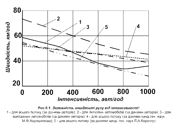Відомі роботи вітчизняних і зарубіжних дослідників відмічали прямолінійну залежність «швидкість - інтенсивність» без рекомендації можливого діапазону стійкого існування такої залежності (див.рис.6.1). Зміна складу руху викликає не лише зміну кривизни, але й загальний нахил кривої до осі «інтенсивність» (див.рис.6.1).