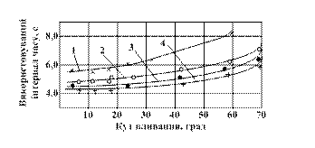 При виконанні правого повороту кут зустрічі (злиття) потоків залежить від величини радіусу поворотів. Ця залежність достатньо добре простежується в даних спостережень (рис. 12.2): при зменшенні радіуса повороту інтервал