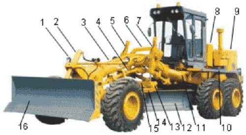 1- передняя фара; 2- гидроцилиндр бульдозерного оборудования; 3- рама автогрейдера; 4-карданный вал; 5,7- гидроцилиндры управления отвалом; 6- подвеска тяговой рамы; 8- топливный бак; 9- воздухоочиститель; 10- крыло; 11- гидробак; 12- отвал; 13- тяговая рама; 14- поворотный круг; 15- редуктор поворота отвала; 16- бульдозерное оборудование