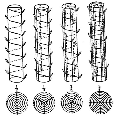 При спиральном листорасположении листья у семенных растений расположены не беспорядочно, а в определенном порядке, характерном для каждого вида растений. Если мысленно соединить линией места прикрепления листьев, расположенных вверх непосредственно один за другим, пока не дойдем до листа, сидящего над тем, с которого начали (т. е. на той же ортостихе), то мы получим так называемую основную или генетическую1 спираль; совокупность листьев в ней, не считая последнего, сидящего на одной ортостихе с первым, называется листовым циклом. Угол окружности, на который отстоит один лист от другого, расположенного над ним или под ним, называется углом расхождения (дивергенция2).