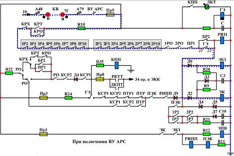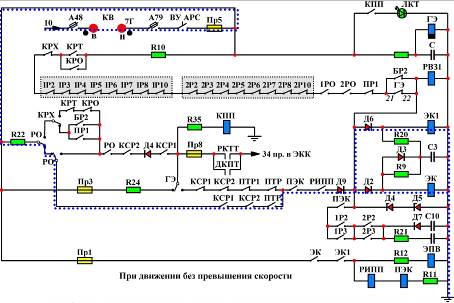 При работе на линии, когда АРС не фиксирует превышения скорости и реле КСР включены и при скорости более 10км/ч катушки ЭК и ЭК1 получают питание по пятой цепи.