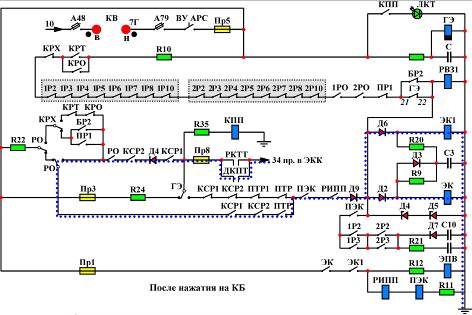 После нажатия машинистом на КБ или ПБ включаются контрольно – скоростные реле КСР1 и КСР2, переключают все свои контакты и катушки ЭК и ЭК1 получают питание по третьей цепи.