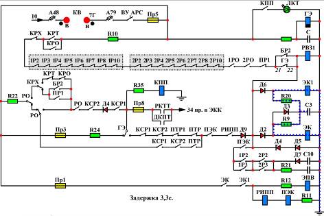 При фиксации устройствами АРС факта превышения скорости обесточиваются оба КСР, контакты которых разрывают цепь питания ЭК и ЭК1, но катушки этих реле в течение 3,3 секунд продолжают получать питание от предварительно заряженного конденсатора С3.
