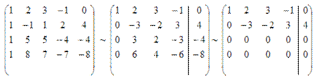 Выписав расширенную матрицу этой системы, после ряда элементарных преобразований (проследить порядок которых рекомендуем самостоятельно), получим: