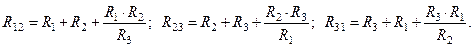 Решая систему тех же трех уравнений относительно сопротивлений R12, R23, R31, получаем формулы для обратного преобразования звезды в эквивалентный треугольник: