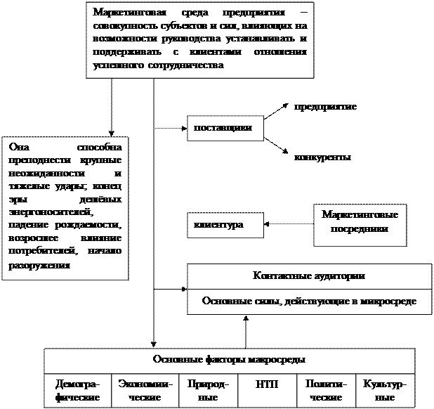 Влияние внешней среды на спрос может быть представлено с помощью моделей, более детально описывающих внешнюю среду. На рисунке 1 приведено описание двух основных компонентов внешней среды: микро- и макросреды, составляющих в совокупности маркетинговую среду предприятия. Микросреда представлена совокупностью активных субъектов и сил, имеющих непосредственное отношение к предприятию, макросреда представлена факторами более широкого социального плана.