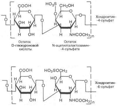 Хондроитин-4-сульфати хондроитин-6-сульфатпостроены по одному плану. Отличие между ними заключается в локализации сульфатной группы. Несмотря на минимальные различия в химической структуре, физико-химические свойства хондроитин-4-сульфата и хондроитин-6-сульфата су-