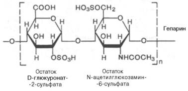 Гепаринизвестен прежде всего как антикоагулянт. Однако его следует относить к гликозаминогликанам, так как он синтезируется тучными клетками, которые являются разновидностью клеточных элементов соединительной ткани. Он может входить в состав протеогликанов; с гликоз-аминогликанами его объединяет и химическая структура.