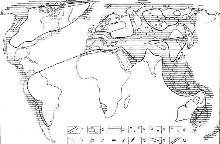 Границы: 1—платформ, 2 — суши и моря; 3 — море; 4 — рифы; 5 — эвапориты; области: 6 — вулканизма, 7 — континентального осадкона-копления, 8 — оледенения; 9 — угленакопление; горы: 10 — складчатые,