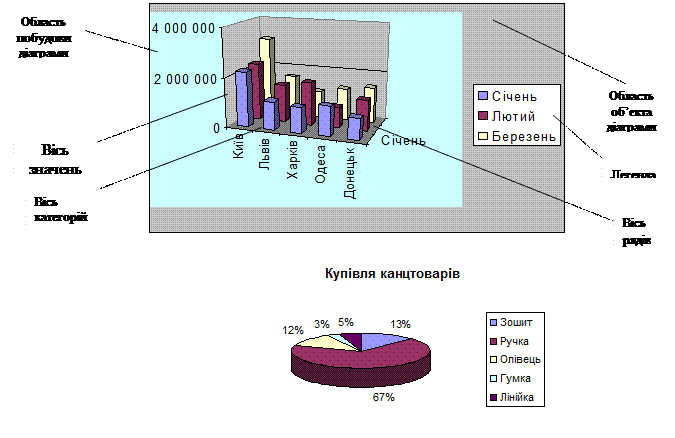 Рис.1. Кругова (об’ємна), точкова і стовпцева діаграми.