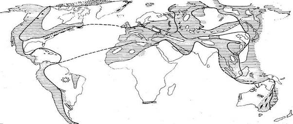 Рис. 6. Палеогеографическая схема мира. Поздний девон. Составил