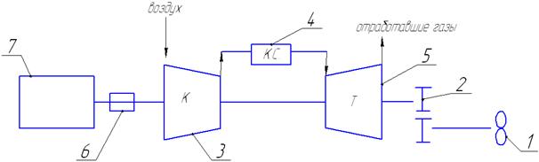 В процессе сгорания топлива, образующиеся газы при высокой температуре направляются в турбину, где их тепловая энергия преобразуется в механическую работу. Течение газа вдоль проточной части турбины сопровождается уменьшением их давления до значения, близкого к 1 ата. Из турбины газы выбрасываются в окружающую среду. Развиваемая турбиной мощность частично затрачивается на привод компрессора, остальная же (меньшая) ее часть передается потребителю энергии 1 (в данном случае гребному винту) через редуктор 2. запуск установки производится с помощью электродвигателя 7, ротор которого может быть с помощью специальной муфты 6 соединен с ротором компрессора.