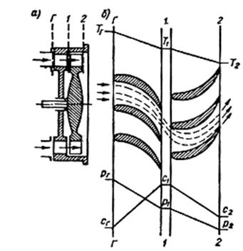 Из сопоставления рисунков явствует, что в рабочем колесе, как и в сопловом аппарате, происходит изменение параметров газа и направления его движения, причем последнее обусловлено профилем и взаимным расположением рабочих лопаток.